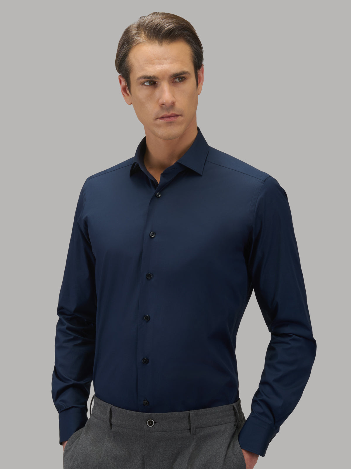Compact yarn stretch poplin represents an elevated expression of comfort and durability. With its 96% cotton composition, it offers a pure, natural feel against the skin, enhanced by a technical component that elevates its performance. Paired with slim and tailored fits, it creates an essential yet sophisticated shirt, destined to become a new wardrobe staple.