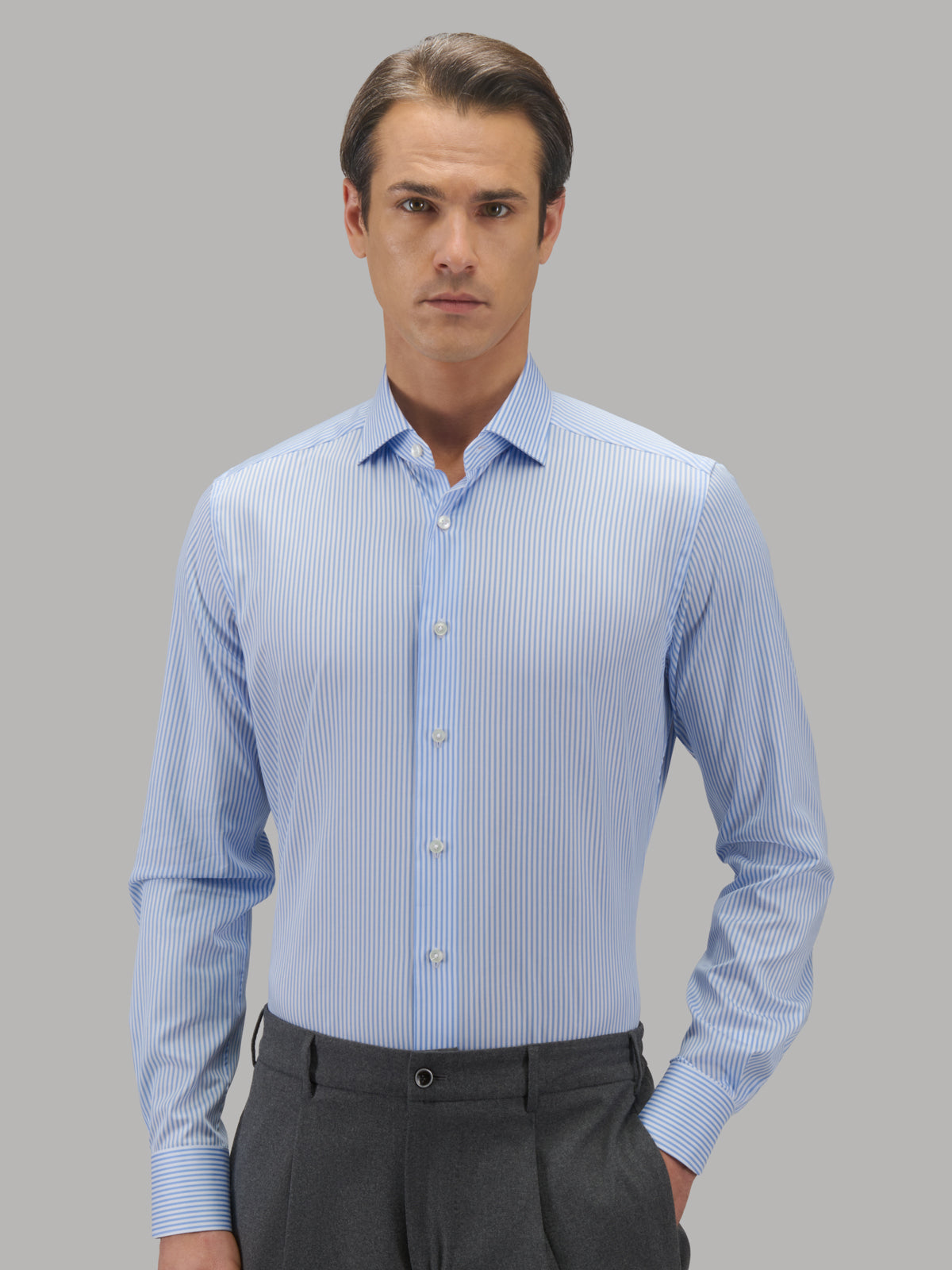 The fabrics of the Travel Shirt line reinterpret sartorial tradition through advanced textile innovation, ensuring a flawless, crease-resistant appearance throughout the day. This compact yarn twill, rich and structured, expresses superior quality, ideal for business settings and all occasions where elegance is essential. Its compact surface and vibrant color enhance depth, maintaining a consistently refined look over time.
