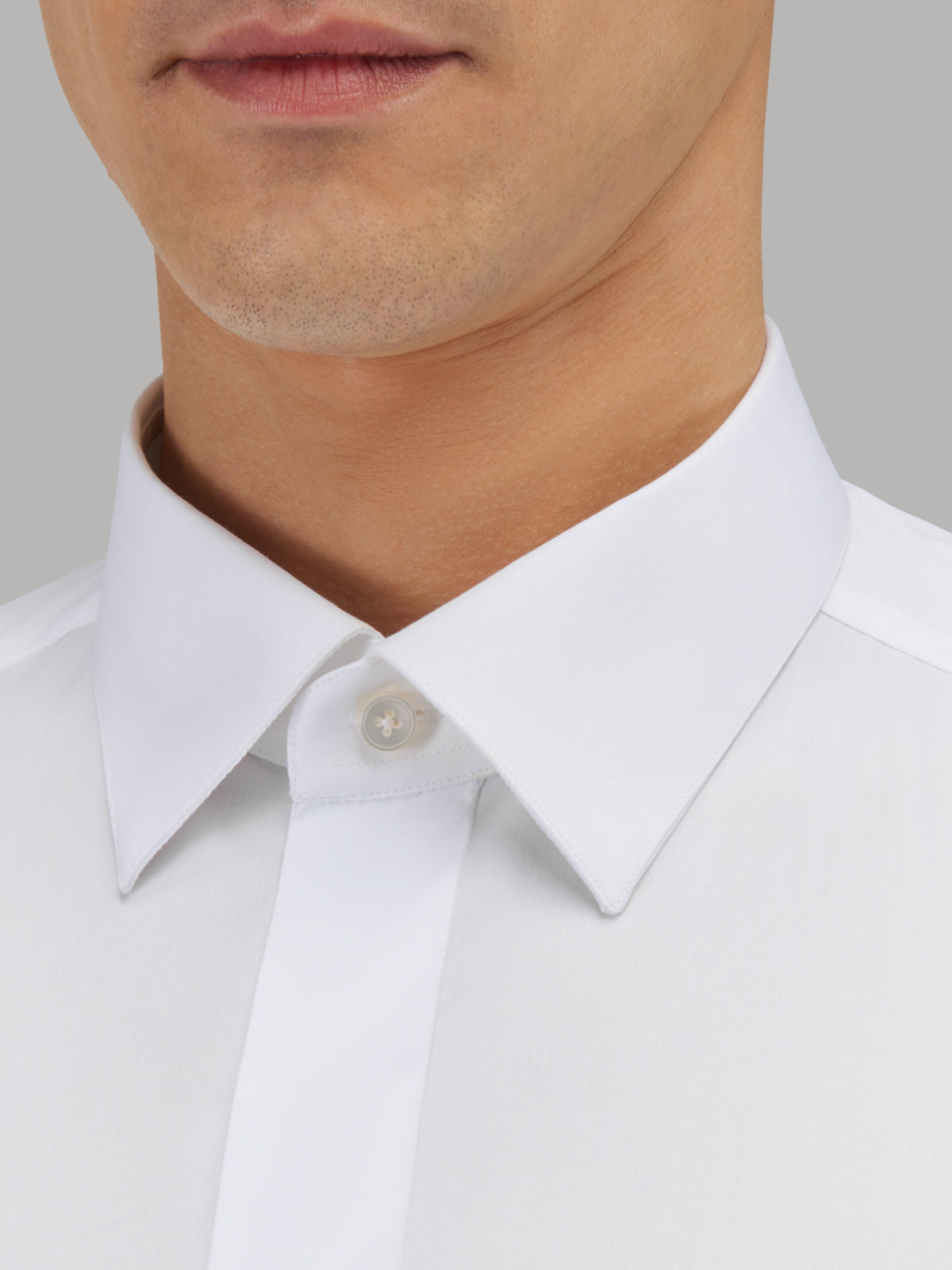 Stiff spread collar with removable stiffeners and edge stitching. Formal shirt for situations of great class.