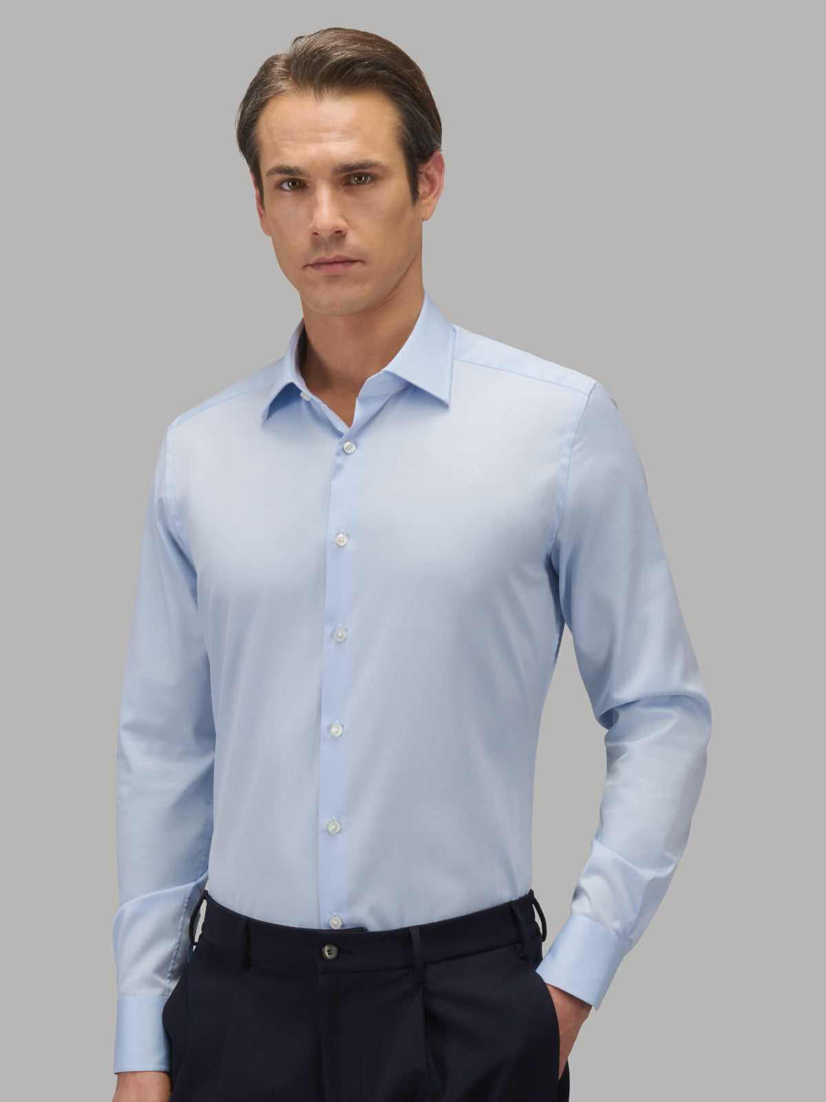 La camisa que no necesita planchado con cuello italiano aprovecha la temperatura del cuerpo para mantenerse sin arrugas durante todo el día. Ofrecerás siempre una imagen perfecta sin alterar la comodidad ni los detalles de corte sastre, como las ballenas extraíbles y las costuras inglesas.